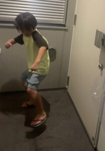 うちの息子たちは、こんな陽気の日はもちろん寒い日も半袖半ズボンで過ごしています。時にはこのようにビーチサンダル台風で外に出ています。