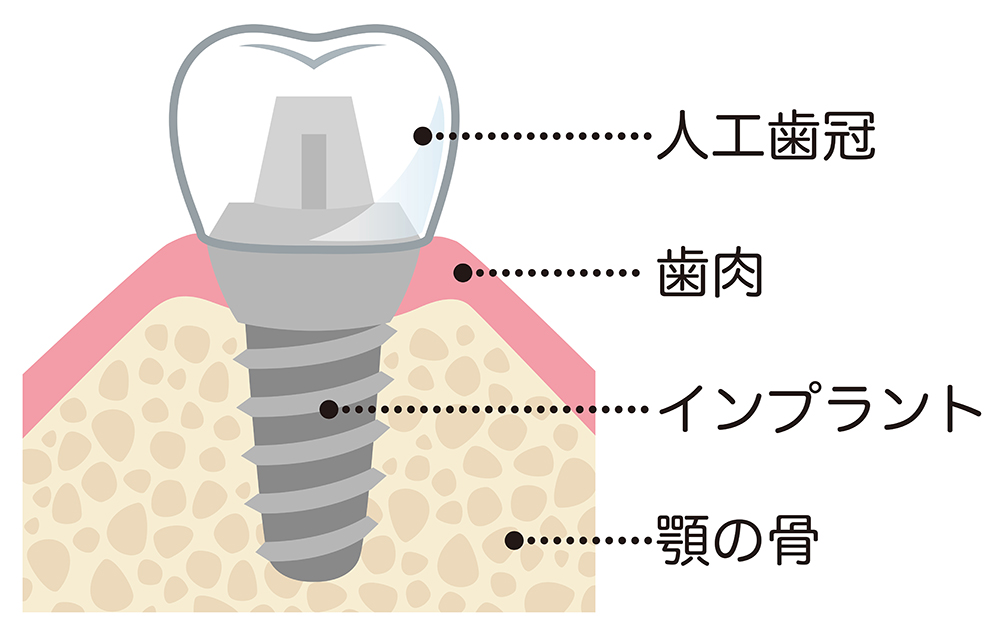 インプラントは顎の骨にチタン製の人工歯根を埋め込む治療法です。歯の頭の部分である歯冠(しかん)だけでなく、歯の根っこの部分である歯根まで回復できるのはインプラントだけです。歯を1本失ったケースから、すべての歯を失ったケースまで幅広く適応できます。
